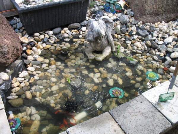 This is my first pond, it contains mainly common goldfish, several fantails, and some telescopic-