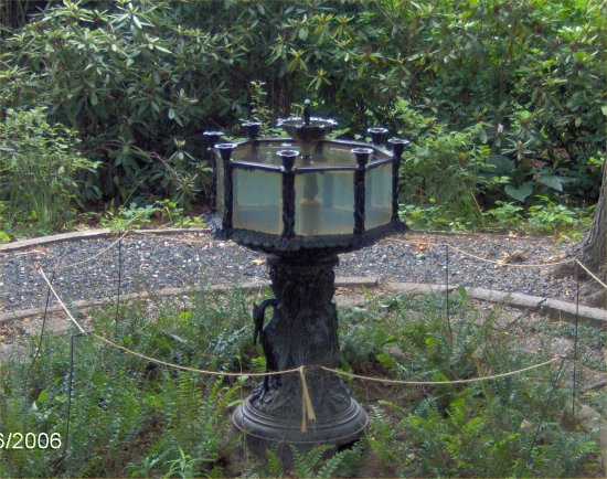 Round pond in the Victorian Garden with lilies, lotuses, and parrot