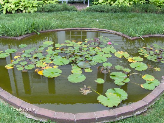 Round pond in the Victorian Garden with lilies, lotuses, parrot feather,